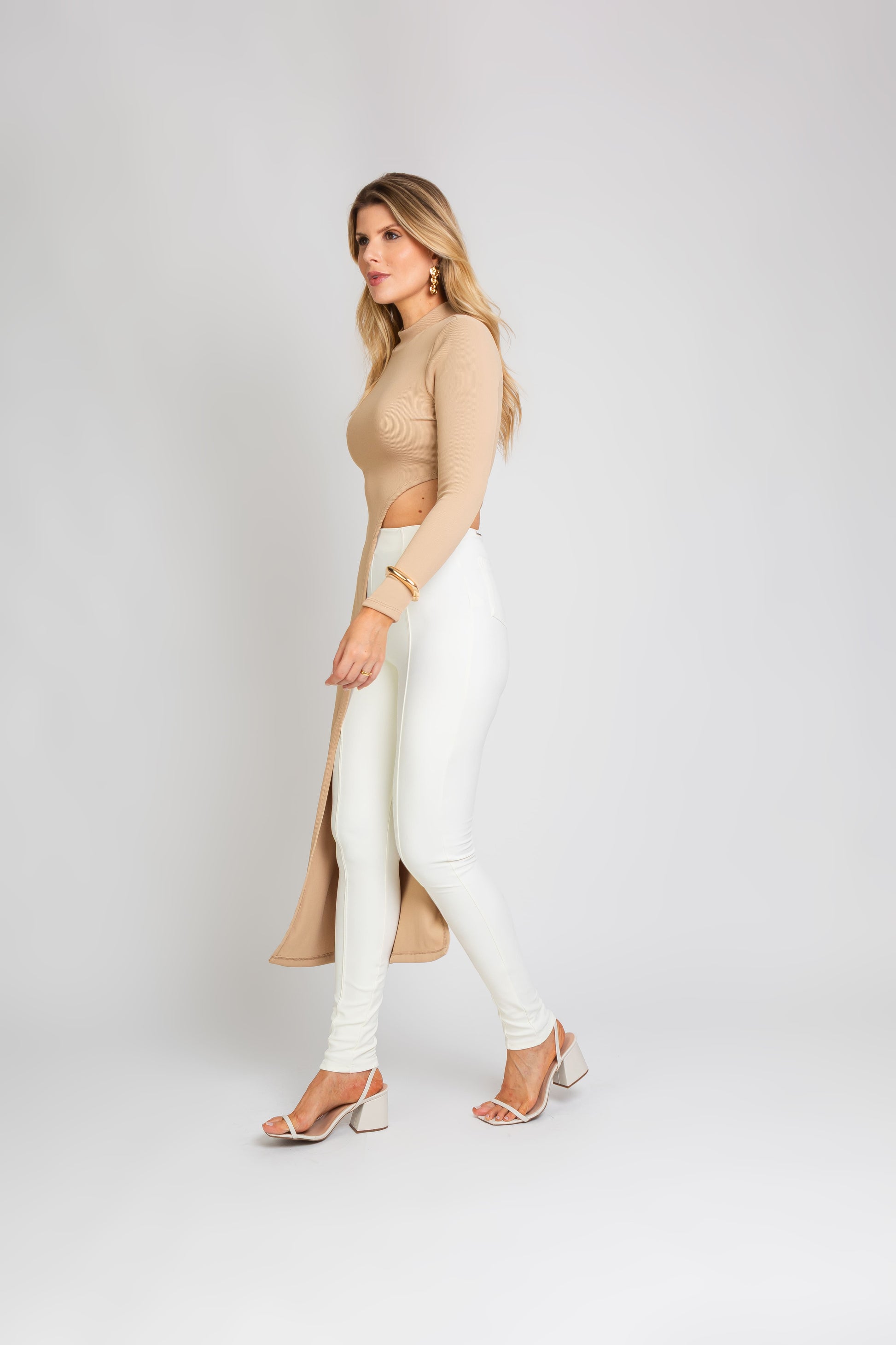 Blusa em poliamida, com gola alta, mangas longas e recortes laterais estratégicos que valorizam a silhueta. O detalhe assimétrico traz um toque moderno e sofisticado, perfeito para composições elegantes.