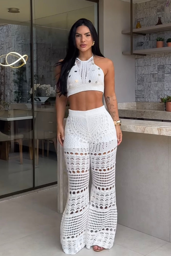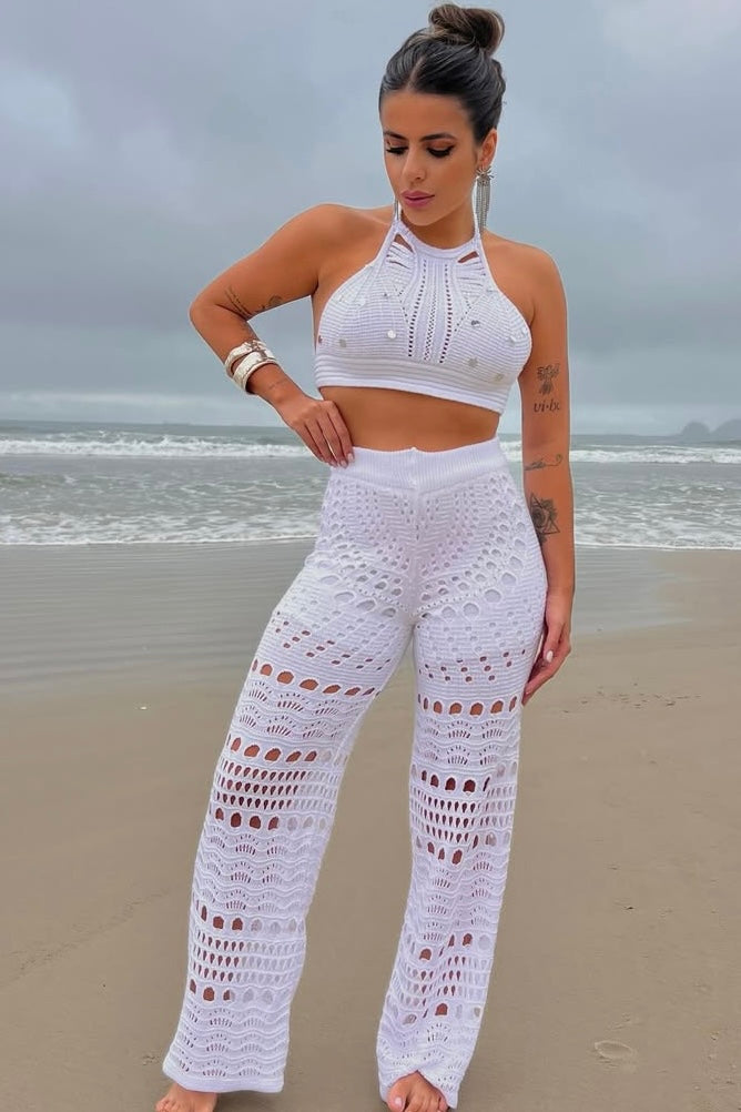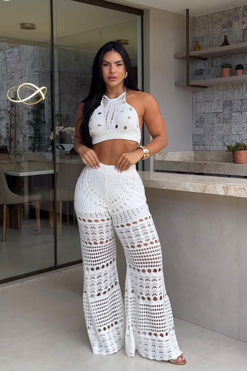 Top frente única com amarração no pescoço, calça rendada com transparência e hot pant inclusa. Sofisticado e perfeito para dias de verão com estilo e leveza.