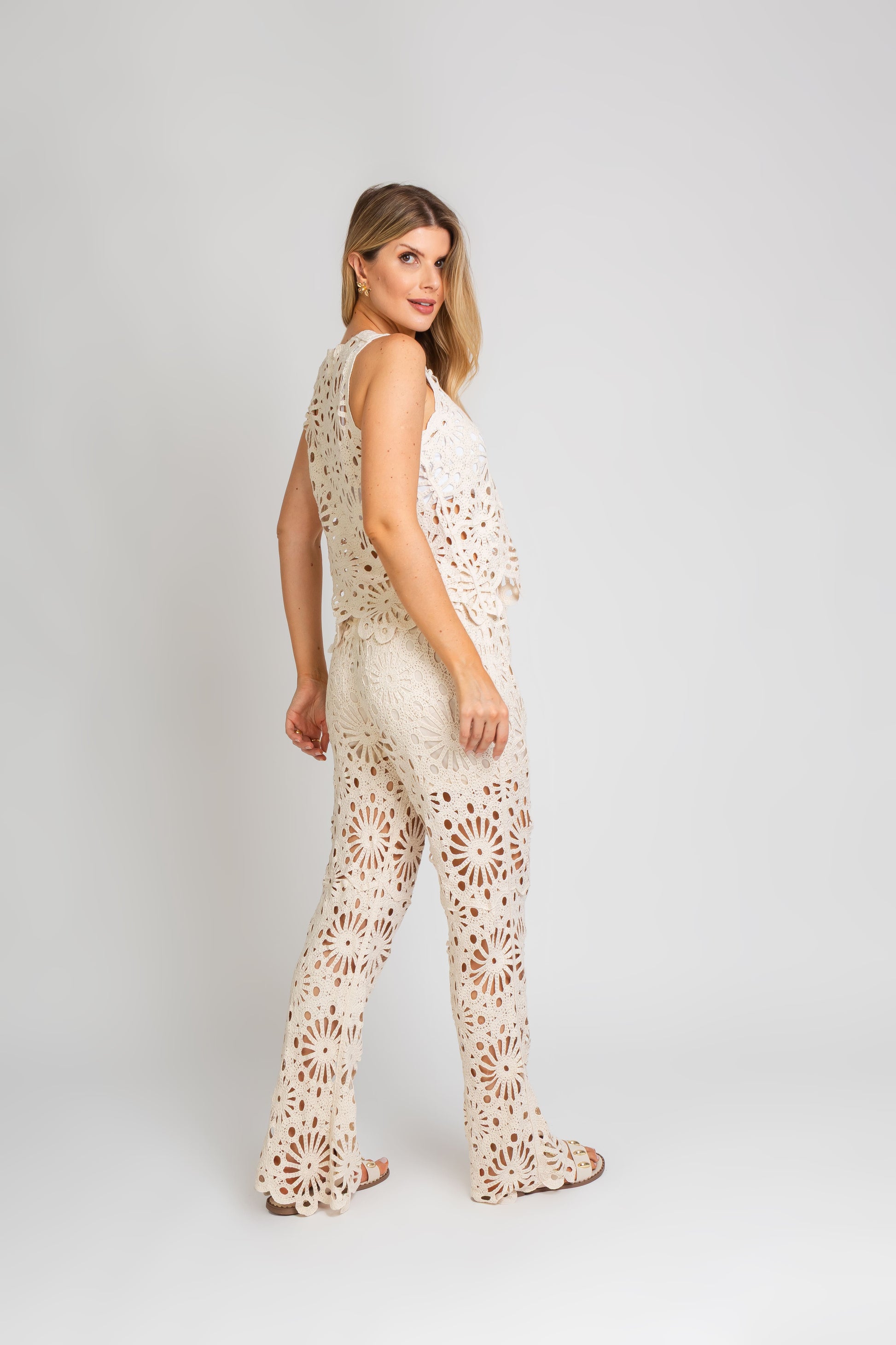 -Calça Pantalona: Cintura elástica, modelagem fluida e detalhes em crochê floral.