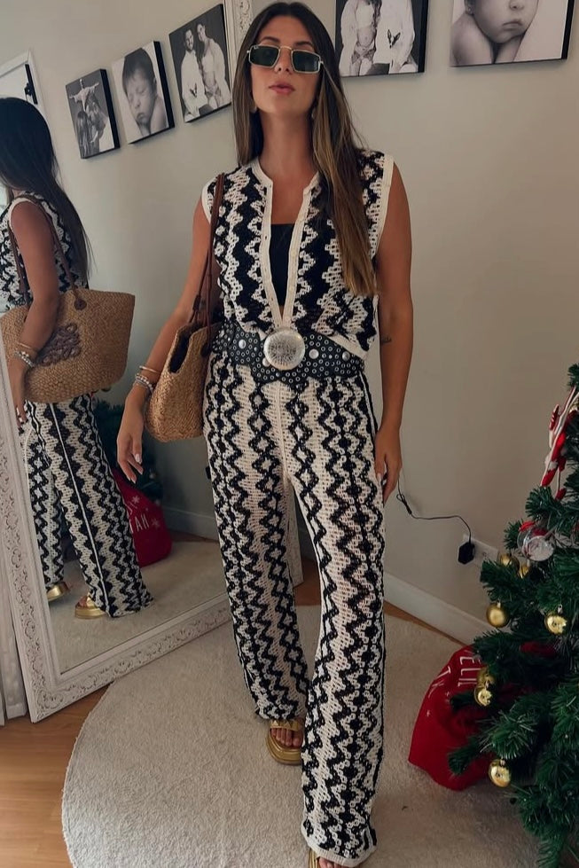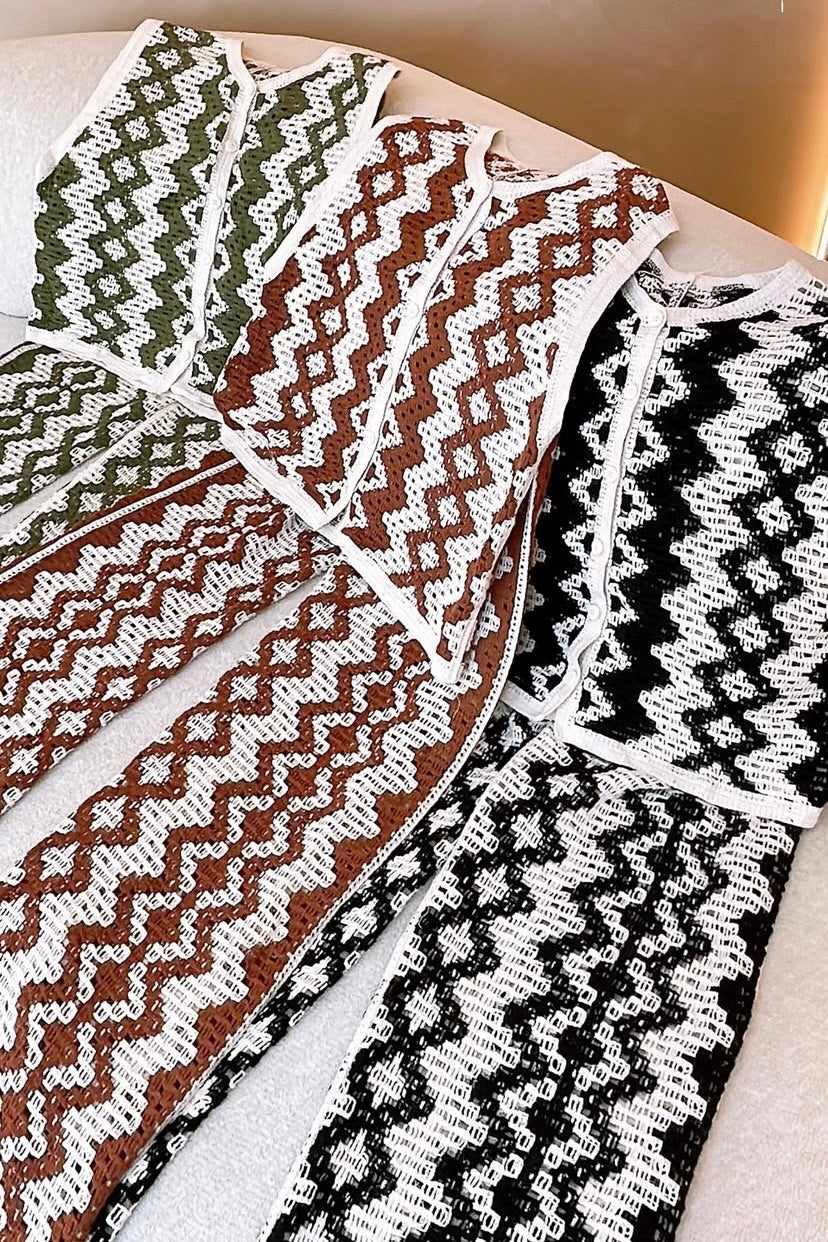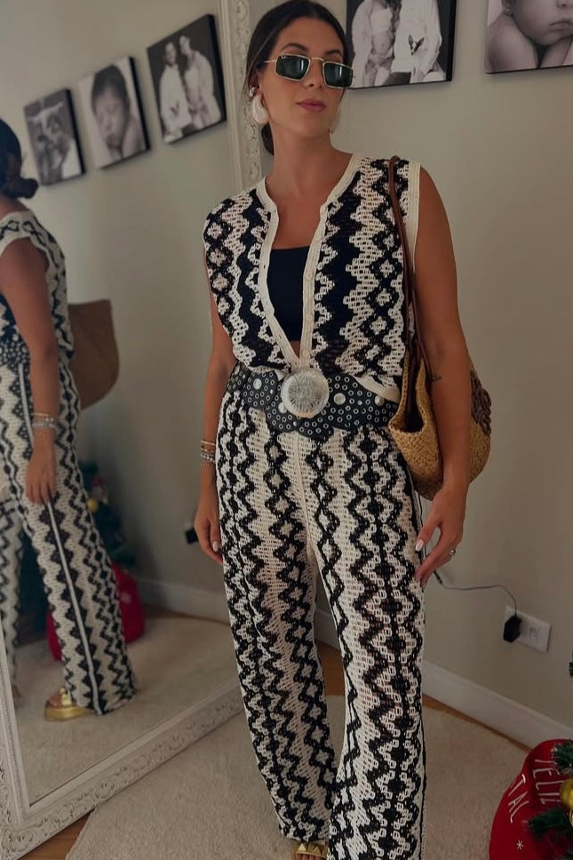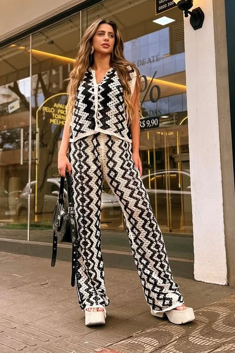 -Calça Pantalona: Cintura elástica, modelagem fluida e detalhes em crochê floral.
