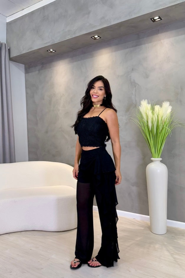 - Calça com design fluido e detalhe em babados, destacando um toque sofisticado.