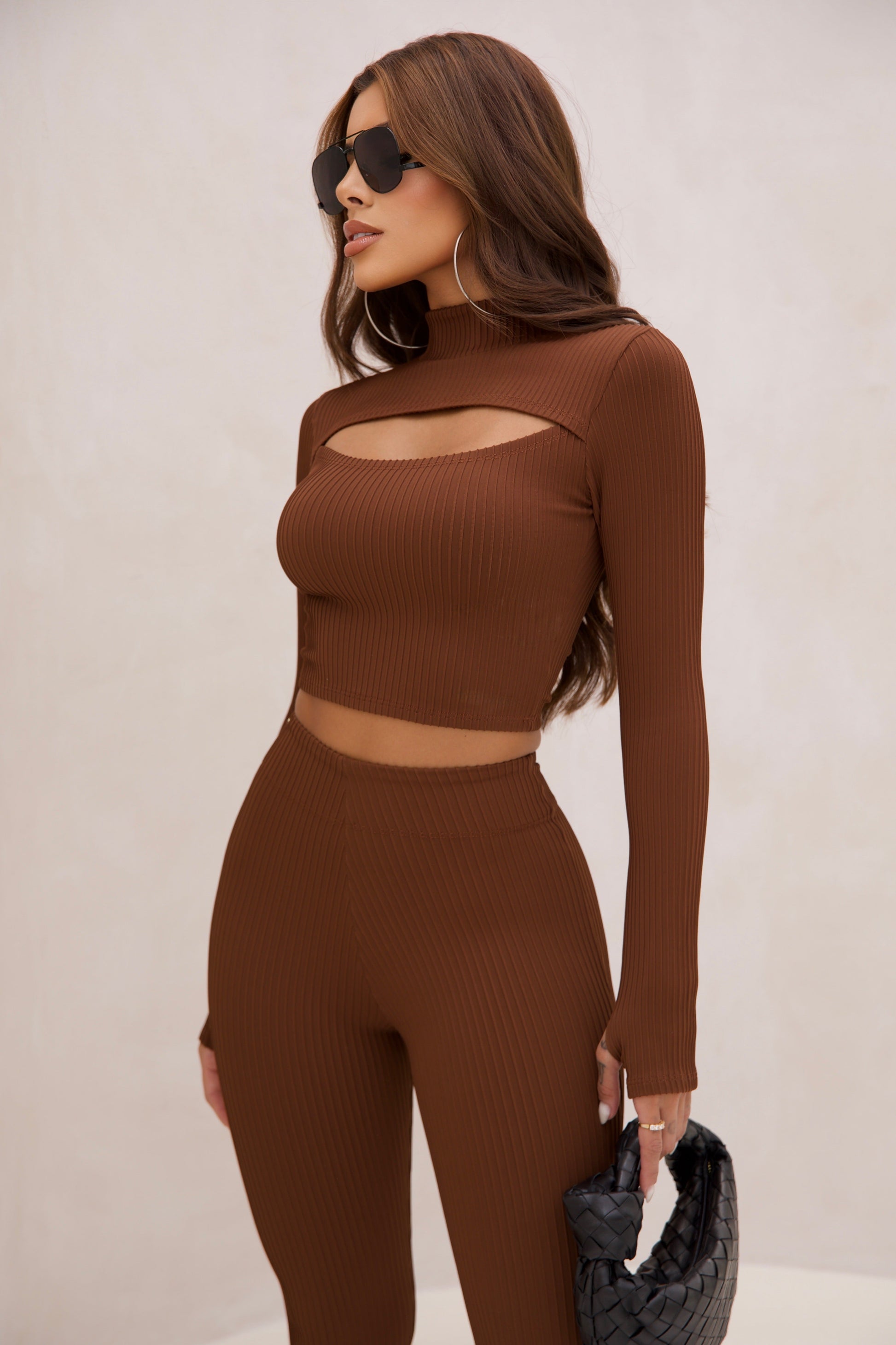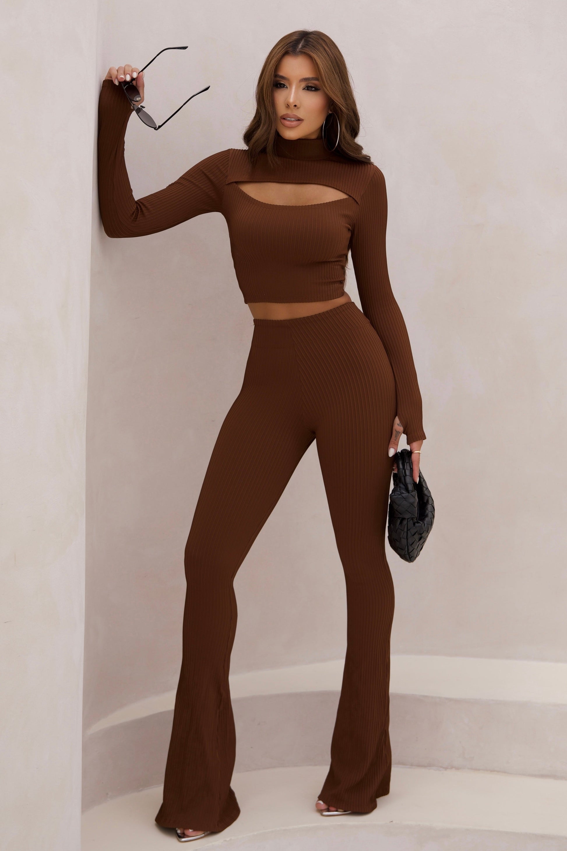 Conjunto Poliamida com Alta Compressão – Calça Flare e Cropped Marrom