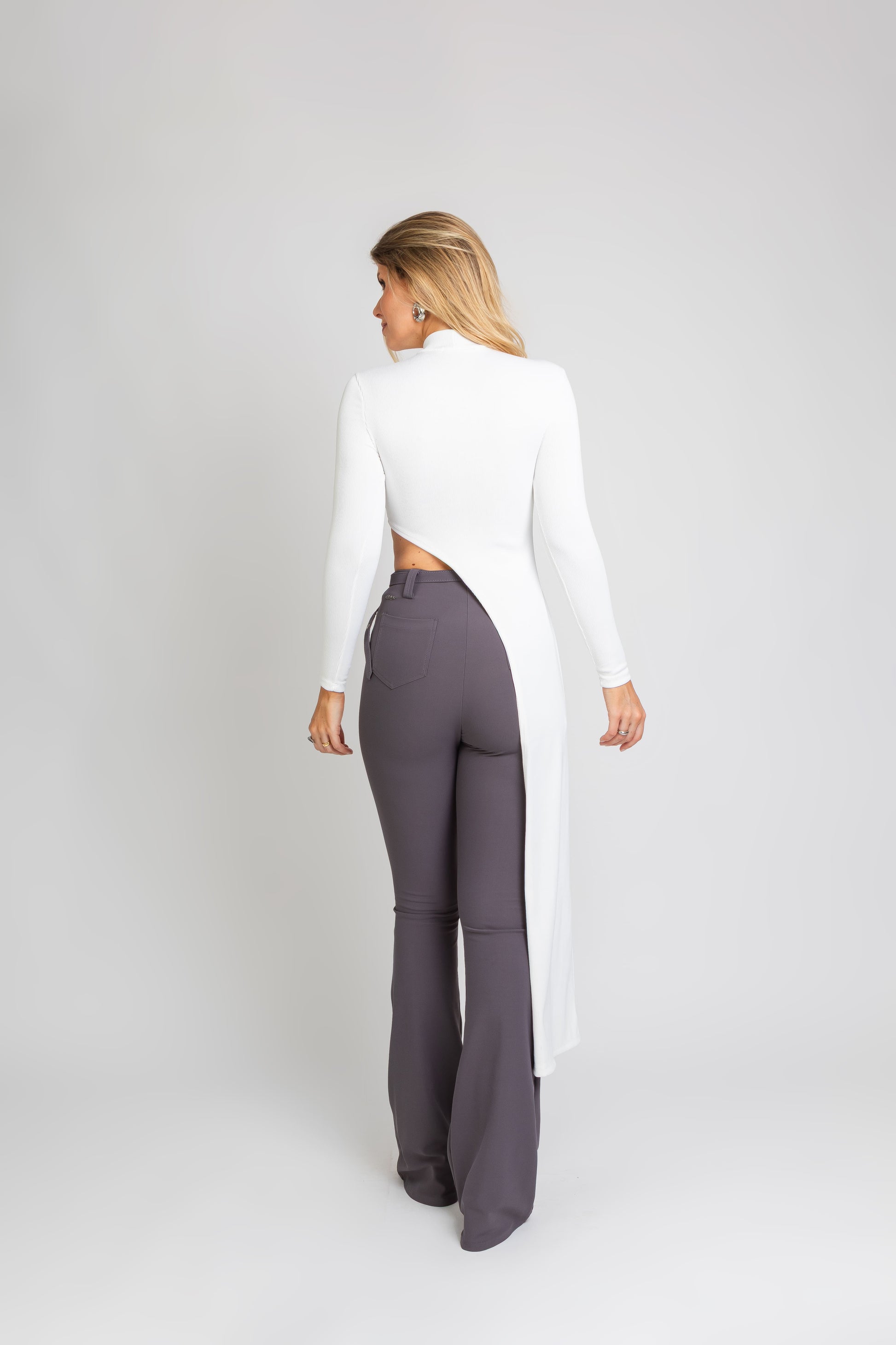 Blusa em de poliamida, com gola alta, mangas longas e recortes laterais estratégicos que valorizam a silhueta. O detalhe assimétrico traz um toque moderno e sofisticado, perfeito para composições elegantes.