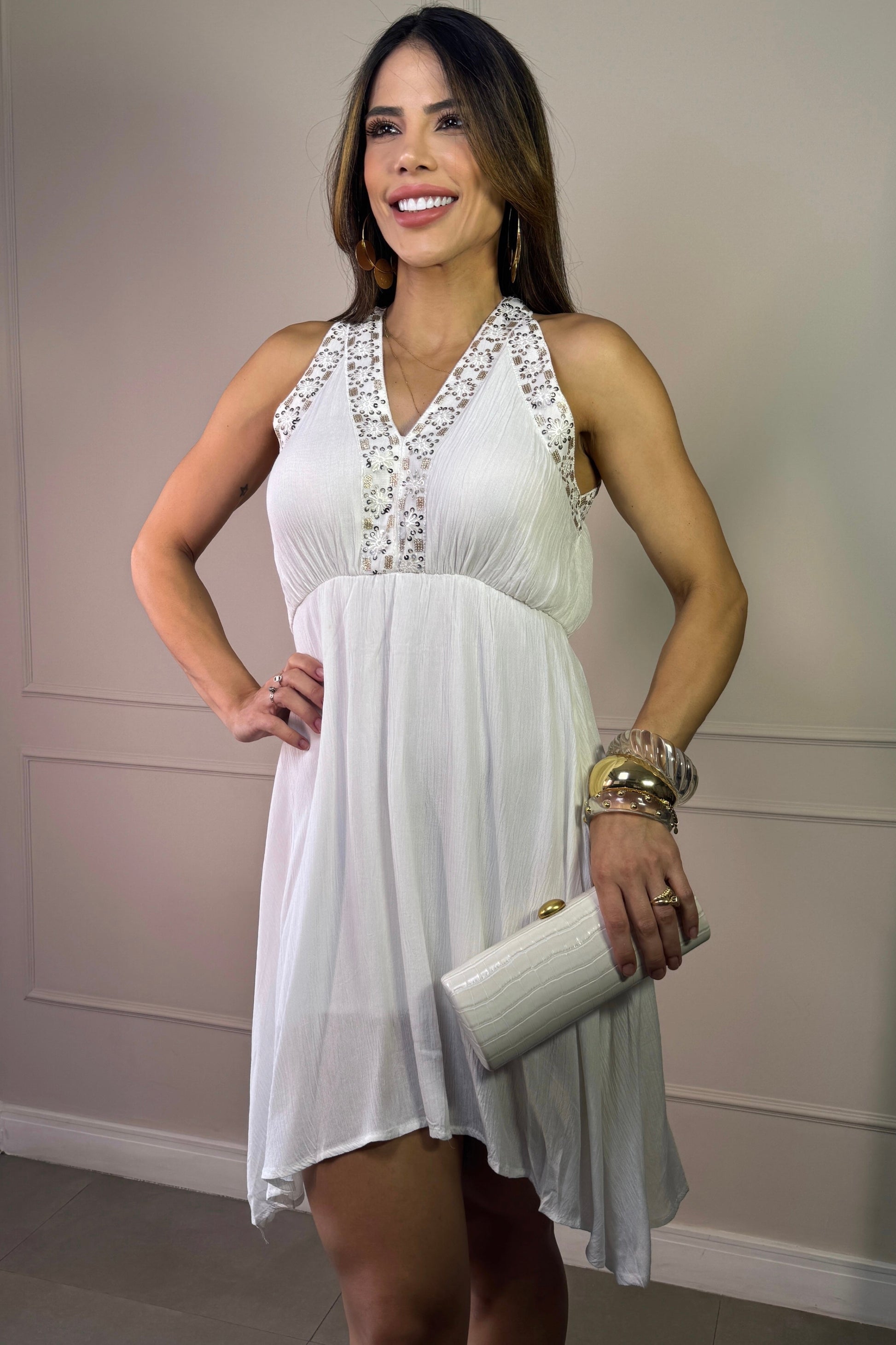 Robe en tissu léger, ornée d’une broderie délicate sur le buste, parfaite pour l’été. Un modèle frais et plein de charme pour les journées ensoleillées.