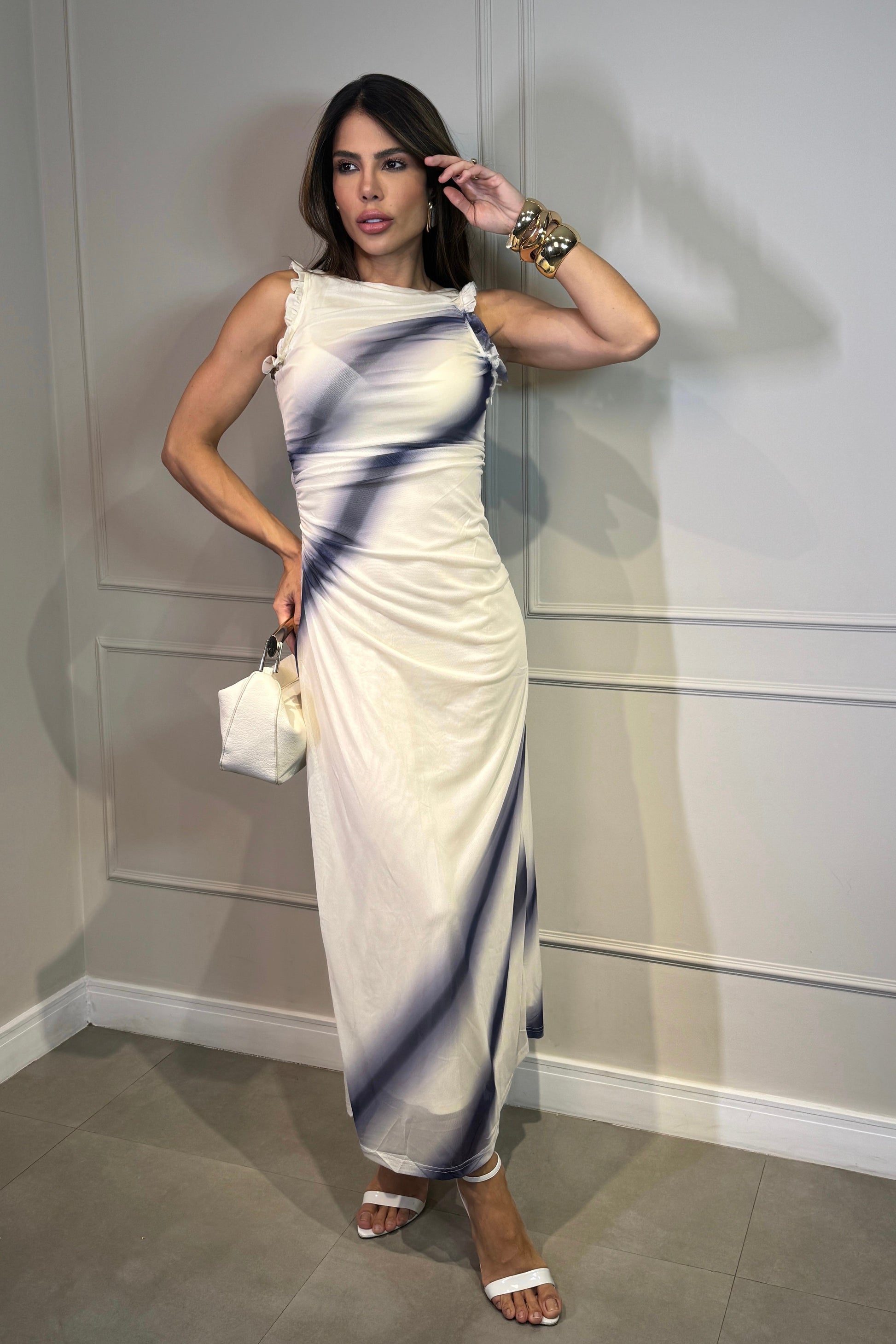 L’élégance et la sophistication définissent cette robe midi en tulle, avec un imprimé exclusif et une coupe impeccable. Le drapé sur le côté et aux épaules met en valeur la silhouette, tandis que la doublure assure confort et sécurité.